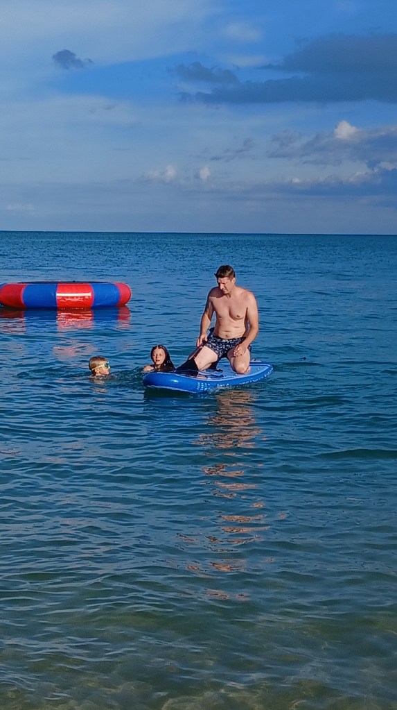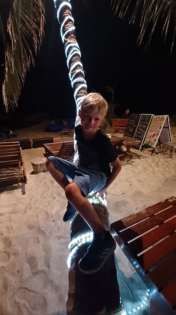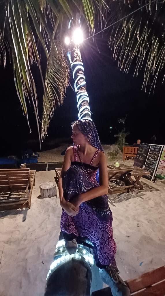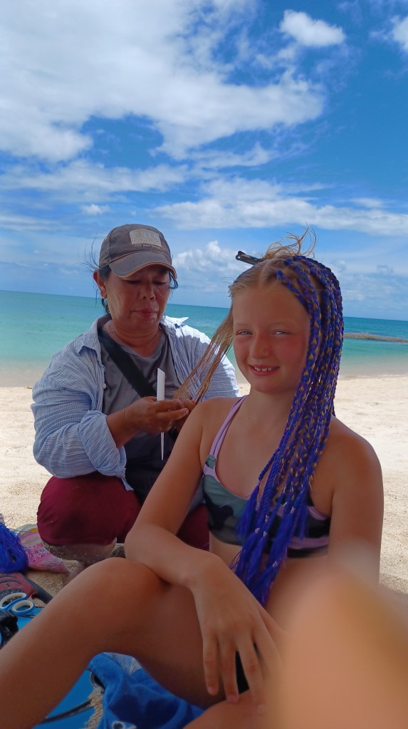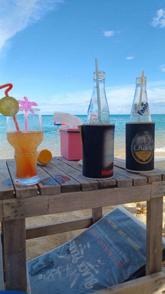 Wie wunderbar: weißer Strand, blaues Wasser und Sonne, cocktails im Wasser, bequeme sitzsäcke und leckeres Essen uuuunnnndd nicht zu vergessen – eine thai Massageliege alle!